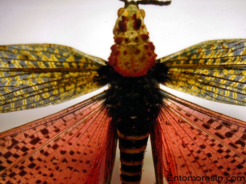 Species of this genus can be found in Southern, Central and East Africa, through Somalia and Madagascar to India. This locust's body is a riot of color; its bold hues are a warning to predators that it's toxic. When threatened, it produces a poisonous froth from openings beneath its wings. This toxin comes from the milkweed plant, which the locust eats, and is strong enough to kill animals and people. |